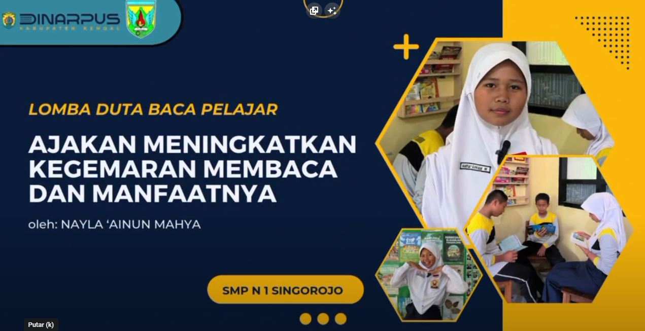 Rizqia Dwi Nata terpilih sebagai Duta Baca Pelajar dalam lomba Duta Baca Pelajar yang diselenggarakan oleh Dinas Perpustakaan Kabupaten Kendal. SMPN 1 Singorojo mengucapkan selamat kepada Rizqia Dwi Nata dan pendamping, semoga terus berkarya dan berinovasi untuk SMP Negeri 1 Singorojo.